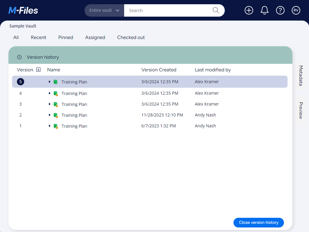 Result:M-Files creates a new version of the object with the metadata and the content of the version you selected in step 3.