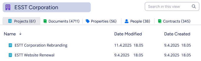 A workspace shows all content related to one object, for example, a customer. You can open a workspace for a customer object to see everything connected to it, for example, projects, documents, and contracts, as tabs.
