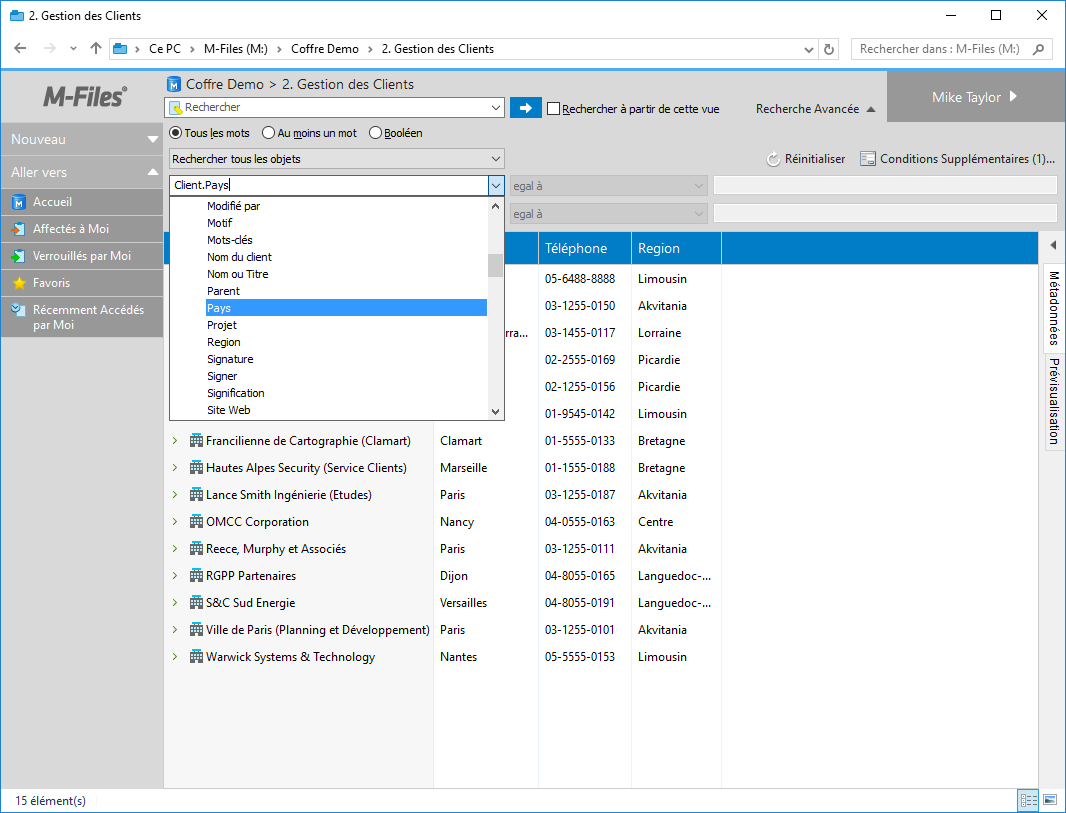 Chaque objet possède des valeurs de propriété, qui peuvent être utilisées pour rechercher des documents de manière précise. La valeur de propriété Projet peut par exemple être Agrandissement hôpital (Floride). Si vous effectuez une recherche avancée avec ces valeurs, la recherche retrouve tous les documents dont la propriété de Projet contient la valeur Agrandissement hôpital (Floride). Vous pouvez également restreindre la recherche à un type d'objet spécifique, tel que clients ou contacts.