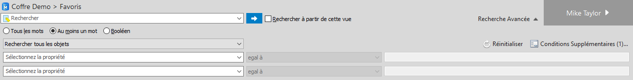 Les critères de recherche subordonnés peuvent être utilisés avec l'opérateur "est". Pour les conditions supplémentaires, l'opérateur "parmi" peut également être utilisé.