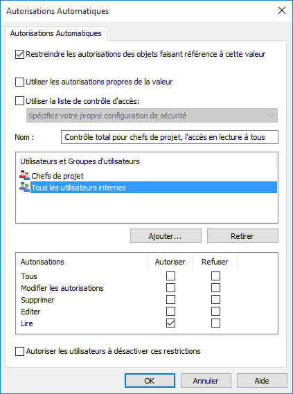Activez la commande Restreindre les autorisations des objets faisant référence à cette valeur lorsque vous souhaitez activer les autorisations automatiques.