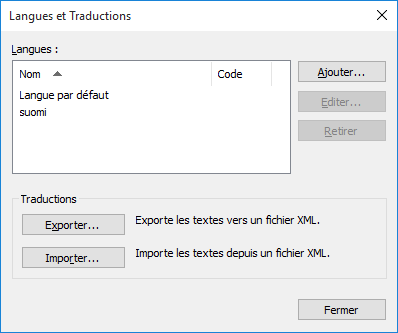 A l'aide des boutons sur la droite, vous pouvez ajouter, modifier et retirer des langues de traduction. Vous pouvez définir un code pour la langue de traduction, en option.