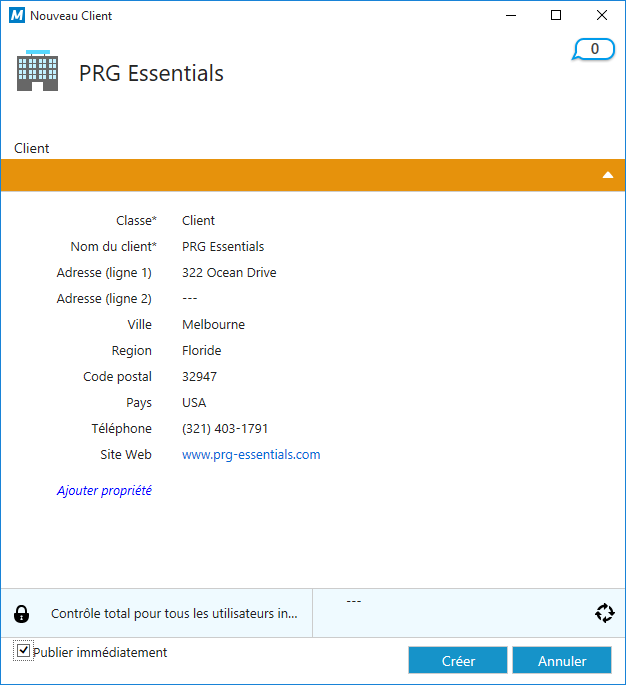 Après avoir saisi les valeurs dans les champs obligatoires (marqués d'un astérisque), l'objet peut être enregistré en sélectionnant Créer. Le fait de sélectionner Annuler supprimera l'objet nouvellement créé.
