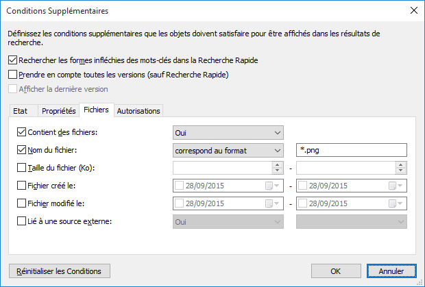 L'onglet Fichiers vous permet de spécifier des critères de recherche liés aux fichiers.