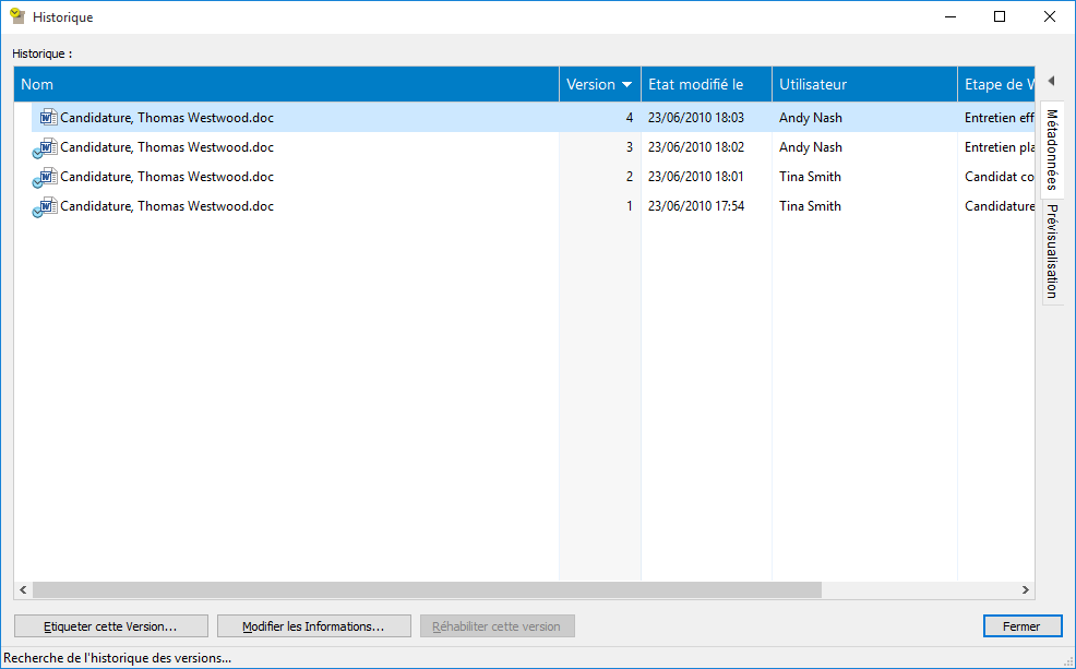 Par défaut, les différentes versions d'un objet sont classées de la plus ancienne à la plus récente sur la base de leur date de création. Vous pouvez restaurer une ancienne version d'un document avec la commande Réhabiliter cette version.
