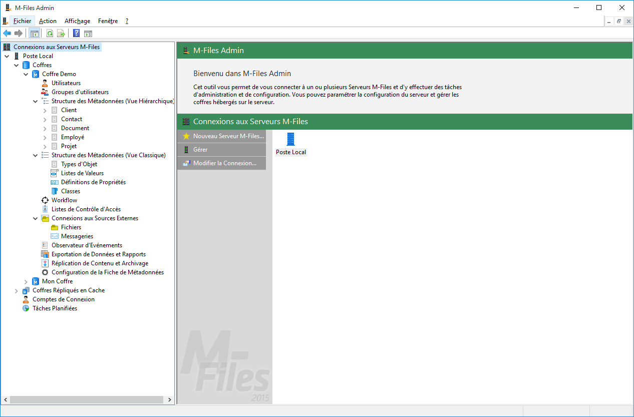 La fenêtre principale M-Files Admin affiche les différents niveaux d'un coffre.