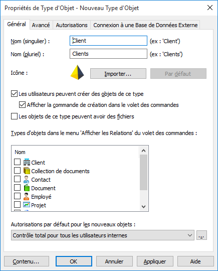 Vous pouvez spécifier l'autorisation par défaut pour des nouveaux objets par type. Lorsque vous créez un objet de ce type, ces autorisations par défaut sont attribuées au nouvel objet.