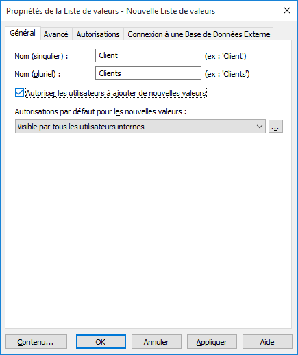 Cochez cette option pour permettre aux utilisateurs d'ajouter de nouvelles valeurs à cette liste de valeurs lorsqu'ils sont en train de renseigner la fiche de métadonnées. Ceci permet aux utilisateurs, par exemple, d'ajouter un client à la liste des clients, directement depuis la fiche de métadonnées.