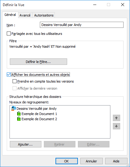 Dans l'exemple ci-dessus, les documents doivent être verrouillés par l'utilisateur Andy Nash, ils ne doivent pas avoir été supprimés et doivent appartenir au type Dessin ou Modèle. Aucune propriété n'a été ajoutée dans la zone Hiérarchie dans cet exemple, donc tous les documents qui remplissent les conditions seront affichés dans le même dossier.