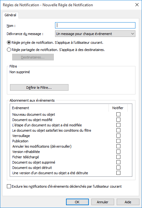Si vous voulez que les notifications ne soient envoyées qu'à vous, sélectionnez Règle privée. Si vous voulez que les notifications soient envoyées à des destinataires particuliers, sélectionnez Règle commune. M-Files Admin est utilisé pour spécifier les autorisations pour la création d'une règle commune. Pour davantage d'informations, veuillez-vous reporter à la section Nouvel Utilisateur.