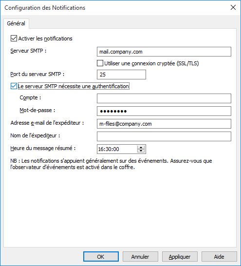 Les utilisateurs M-Files peuvent choisir de recevoir leurs notifications comme messages individuels, ou bien sous forme d'un message quotidien unique et récapitulatif. Spécifiez l'heure à laquelle le message récapitulatif quotidien doit être émis. Pour davantage d'informations, veuillez-vous reporter à la section Paramètres de notification (M-Files Desktop).