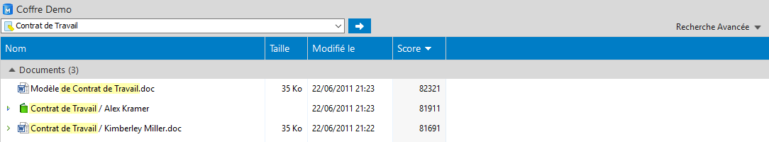 Dans le champ de recherche, saisissez des mots-clés en rapport avec les objets recherchés, par exemple le titre, le compte de connexion d'une personne qui l'a modifié ou un client en rapport avec cet objet, puis cliquez sur la flèche. Il n'est pas obligatoire que le mot-clé soit entier. Vous pouvez tronquer le mot-clé en utilisant un astérisque. Par exemple, quand vous recherchez des données dans le Coffre Démo à partir de la chaîne spécifique*, vous trouverez un document nommé Spécifications techniques car ce nom contient la chaîne recherchée.