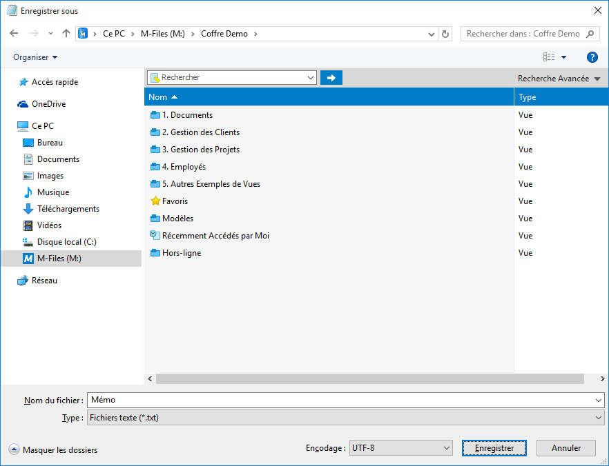 Vous pouvez enregistrer les documents directement dans M-Files à partir des applications que vous utilisez. Le nouvel emplacement d'enregistrement est le coffre.