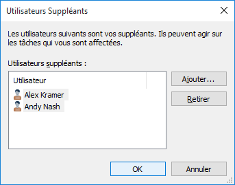 Vous pouvez définir des utilisateurs suppléants pour les périodes d'absence. Les utilisateurs suppléants que vous spécifiez ont le droit d'effectuer les tâches qui vous sont affectées au cours de cette période.