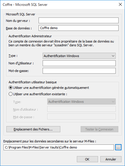 Lorsque Microsoft SQL Server est utilisé en tant que moteur de base de données du coffre, M-Files Server stocke les données dans le coffre de la base de données associée. Certaines données secondaires qui ne nécessitant pas de sauvegarde, comme les index de recherche, sont laissées en dehors de la base de données.