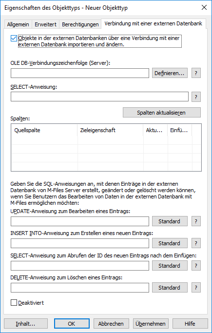 | INSERT INTO | Wenn Sie ein neues Objekt in M-Files erstellen, fügt M-Files Server mittels einer der externen Datenbank INSERT INTO-Anweisung einen Eintrag hinzu. Mit einem Fragezeichen (?) können Sie den Wert der einzelnen Spalten angeben. Anmerkung: Die Eingabe derINSERT INTO Anweisung in M-Files definiert keinen Wert für die ID-Spalte. Konfigurieren Sie die Datenbank so, dass automatisch eine ID für neue Einträge erzeugt wird. In SQL-Datenbanken beispielsweise kann der Typ der ID-Spalte als Identität definiert werden. In Access-Datenbanken ist eine AutoNumber Spalte zu verwenden, um die IDs zu definieren. Excel kann keine neuen ID-Werte erzeugen, sodass INSERT INTO Anweisungen nicht mit Excel verwendet werden können.