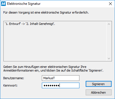 Wenn eine elektronische Signatur für den Statuswechsel definiert wurde, ist die Signatur vor der Änderung des Status für den Benutzer stets erforderlich. Damit der Status geändert werden kann, muss das Objekt eingecheckt sein. Der Wechsel des Status mit einer Signatur kann nur für jeweils ein Objekt erfolgen. Statuswechsel, die eine elektronische Signatur erfordern, können nur von Benutzern ausgeführt werden, die die Windows-Authentifizierung verwenden. Benutzer fügen dem Statuswechsel eine elektronische Signatur hinzu, indem sie ihre Identifikationsdaten eingeben und sich anmelden. Die elektronische Signatur bezieht sich nicht auf einen elektronischen „Fingerabdruck“.