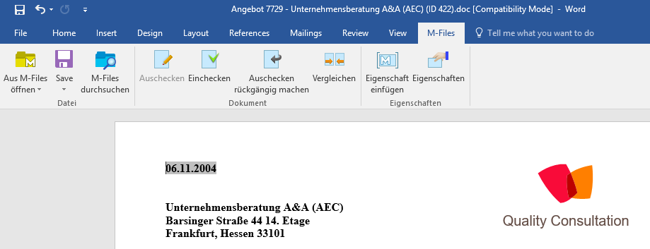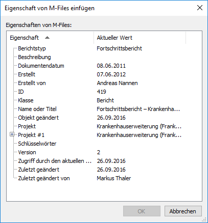 In M-Files gespeicherte Metadaten von Dokumenten können mit der Funktion Eigenschaft einfügen im Dokumenteninhalt verwendet werden.