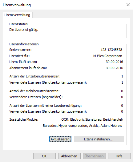 Fenster für M-Files-Lizenzverwaltung.