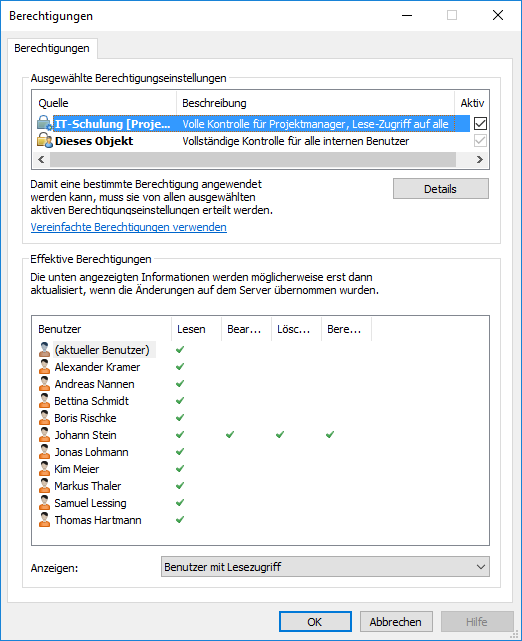 Der für das Objekt selbst festgelegte Zugriff kann den Vollzugriff auf das Dokument für alle Benutzer umfassen, während die automatischen, über ein Projekt zugewiesenen Berechtigungen die Verwendung des Dokuments in der Weise einschränken können, dass nur Projektleitern der Vollzugriff gewährt wird und alle anderen Benutzer nur schreibgeschützten Zugriff haben.