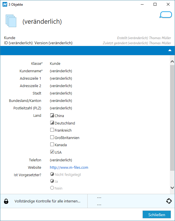 Wenn Sie nun einen Eigenschaftswert bearbeiten, werden die Werte in allen ausgewählten Objekten gemeinsam geändert. Falls bei (veränderlich) ein neuer Wert eingegeben wird, wird dieser Eigenschaftenwert für alle ausgewählten Objekte eingestellt. Falls ein Kontrollkästchen markiert oder die Markierung aufgehoben wird, oder eine Optionsschaltfläche aktiviert oder deaktiviert wird, erfolgt die Hinzufügung bzw. Entfernung des Werts für alle ausgewählten Objekte gemeinsam.