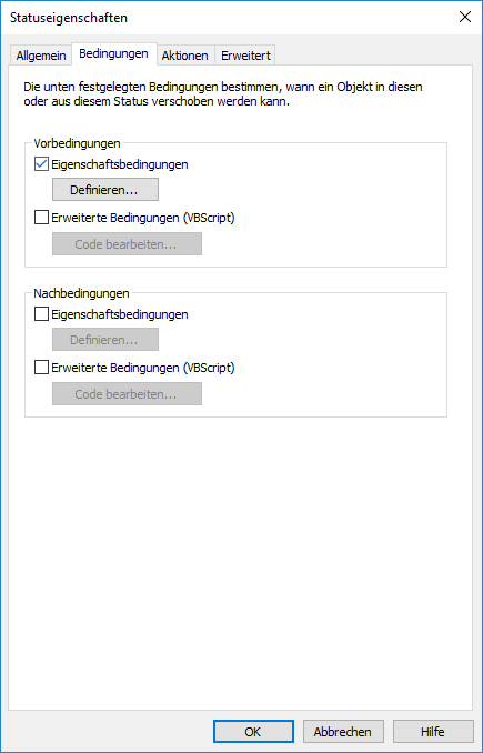 Mit den Statusvoraussetzungen werden die Objekteigenschaften festgelegt, die erforderlich sind, damit das Objekt zu diesem Status wechseln kann.