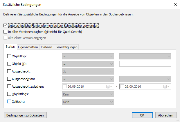Auf dieser Registerkarte werden die Suchkriterien für den Objektstatus eingegeben.