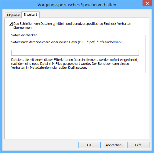 In den erweiterten Einstellungen können Sie die Standardeinstellung Das Schließen von Dateien ermitteln und benutzerspezifisches Eincheck-Verhalten übernehmen deaktivieren.