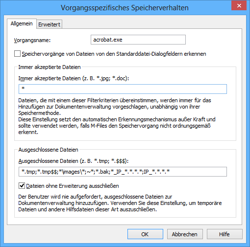 Sie können anwendungsspezifische Regeln für das Speichern von Dateien in M-Files anpassen. Anwendungsspezifische Regeln können beispielsweise verwendet werden, um zu verhindern, dass temporäre Dateien und andere unerwünschte Dateien in der Dokumentenverwaltung gespeichert werden. Regeln können auch verwendet werden, um Vorgänge mit Anwendungen zu ermöglichen, die spezielle Methoden zur Dateisicherung verwenden. Die Regeln können beispielsweise sicherstellen, dass ein Metadatenformular neuer Dateien angezeigt wird, wenn die automatische Identifikation nicht funktioniert.