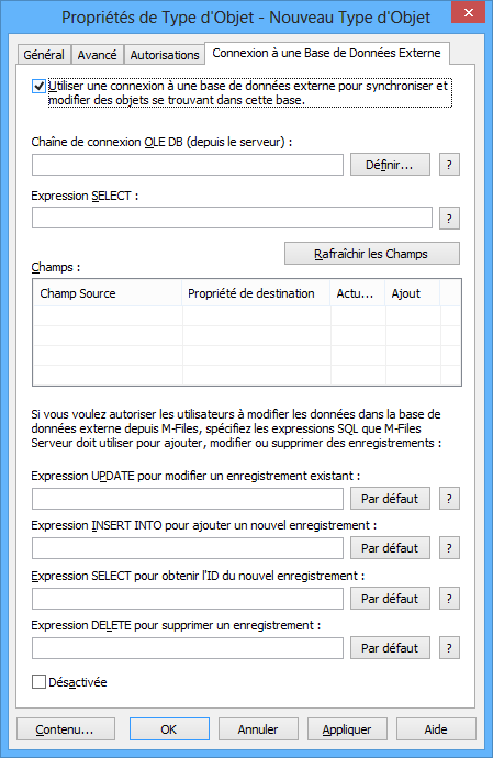 Dans l'onglet Connexion à une base de données externe, vous pouvez définir le type d'objet pour utiliser une connexion à une base de données externe.