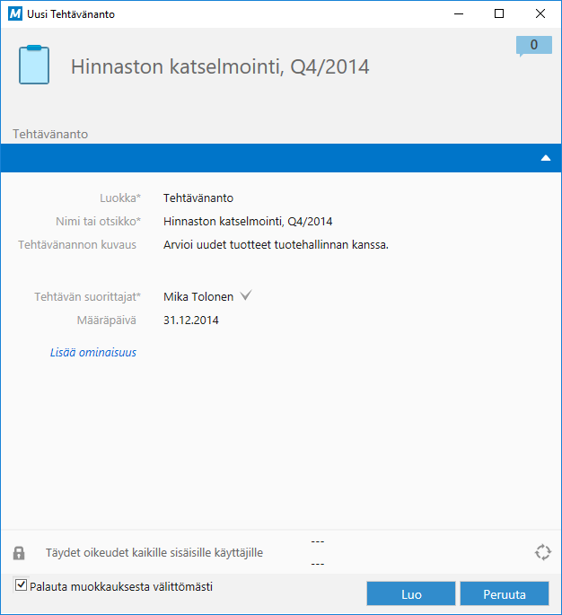 Kun haluat antaa uuden tehtävän suoritettavaksi, luo uusi Tehtävänanto-kohde. Koska tehtävänannot ovat kohteita, voit määrittää saman tehtävänannon usealle eri kohteelle. Tai käänteisesti voit lisätä useita eri kohteita samalle tehtävänannolle. Voit esimerkiksi laittaa useita työvedoksia tarkistettavaksi toiselle henkilölle samalla tehtävänannolla.