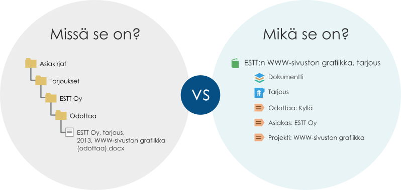 M-Files järjestää aineistoa sisällön ja siihen liittyvien asioiden eikä tallennuspaikan perusteella.M-Files on saatavana paikallisena, pilvi- tai hybridiratkaisuna. Katso lisätietoja kohdasta Järjestelmän yleiskatsaus.