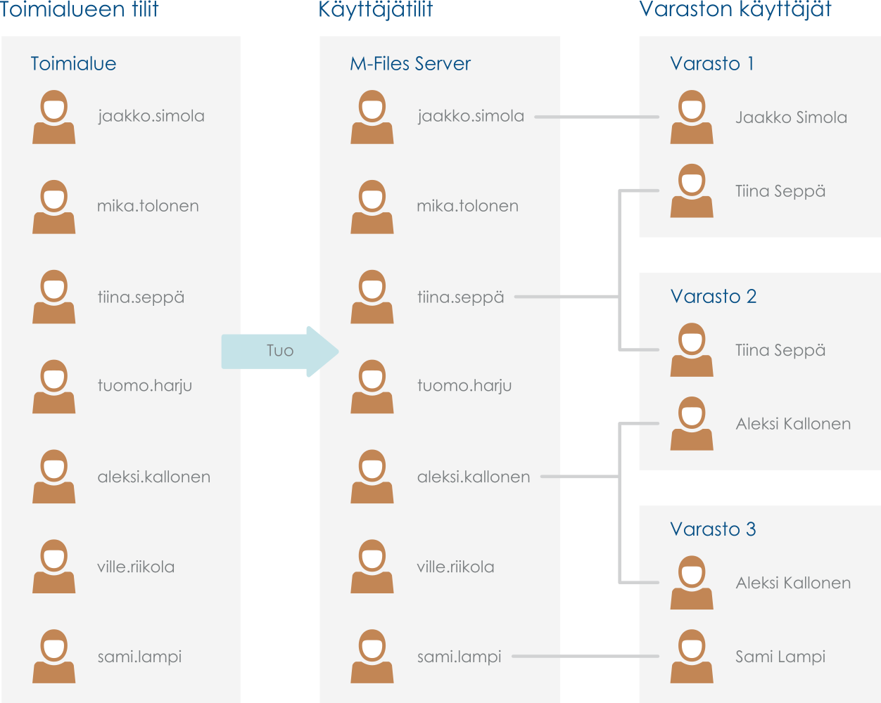 Varastolla on käyttäjiä, joiden on ensin tunnistauduttava M-Files Server -palvelimella. Ennen käyttäjien luomista sinun on luotava käyttäjätilit M-Files Serverille. Näitä käyttäjätilejä lisätään varastoille käyttäjiksi. Sama palvelimen käyttäjätili voidaan lisätä useille varastoille.