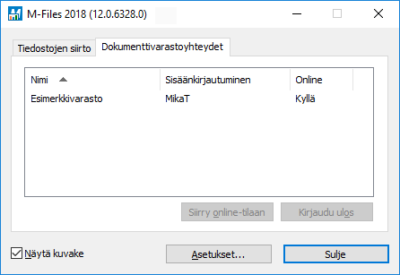 Jos olet kirjautunut sisään johonkin dokumenttivarastoon, Kirjaudu ulos -painikkeella kirjaudut ulos ja lopetat M-Files Desktopin käyttämisen. Painikkeen toiminto vaihtelee kyseisen tilan mukaan.