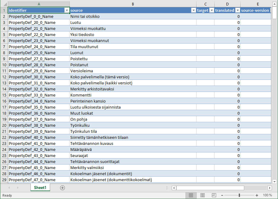 Viety XML-taulukko avattuna Excelissä kääntämistä varten.