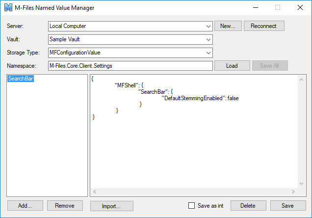 Huomaa: Näiden asetusten jakamista varten tarvitaan M-Files Named Value Manager. Katso sovelluksen lataaminen ja sen käyttöohjeet dokumentista Distributing Vault-Specific