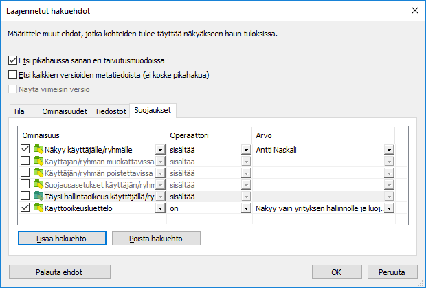 Huomaa: Hakutulokset eivät välttämättä ole täsmälliset tai et saa niitä ollenkaan, jos käytät Käyttöoikeusluettelo-ehtoa ja valitset nimetyn käyttöoikeusluettelon, joka käyttää pseudokäyttäjiä kohteiden metatiedoista. Katso lisää eri mahdollisuuksista kohdista Pseudokäyttäjät ja Nimetyt käyttöoikeusluettelot.