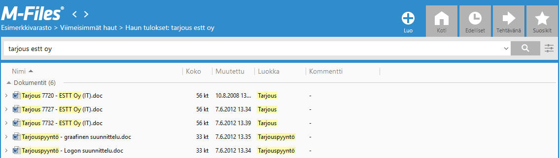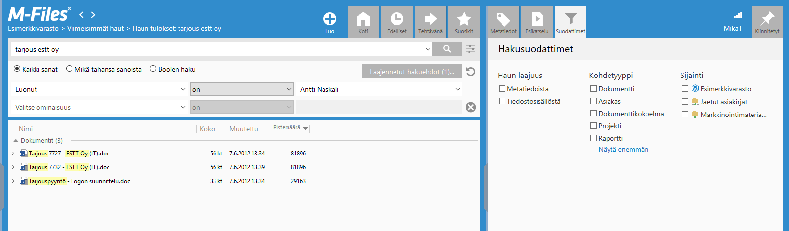 Käyttöliittymän yläosassa oleva pikahaku on kätevä tapa etsiä dokumentteja ja muita kohteita M-Filesista. Voit rajoittaa hakutuloksia käyttämällä haussa useita hakusanoja: sanalla tarjous hakemisen sijasta voit kokeilla hakea sanalla tarjous ja kirjoittamalla perään asiakkaan nimen: