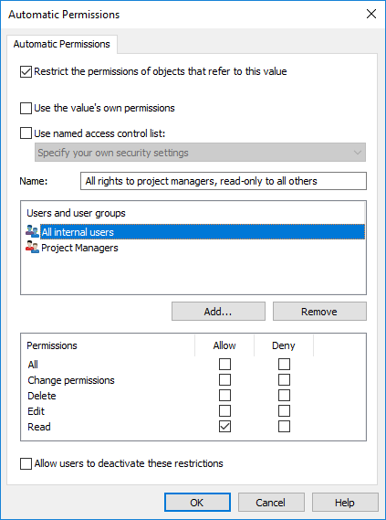 You can also specify whether the users are allowed to deactivate the automatic permission restrictions created through this value, so that the users can delete the preset automatic permissions if necessary.