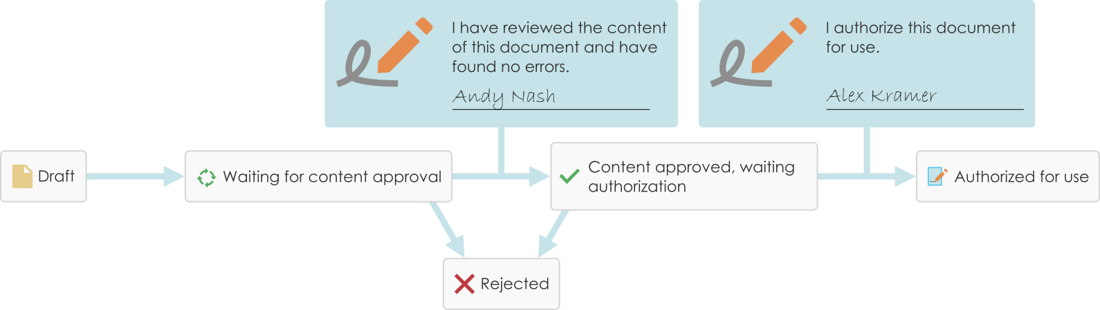 The module with the electronic signature feature expands the workflows. You can use electronic signatures to certify the state transition. For example, approval of documents.
