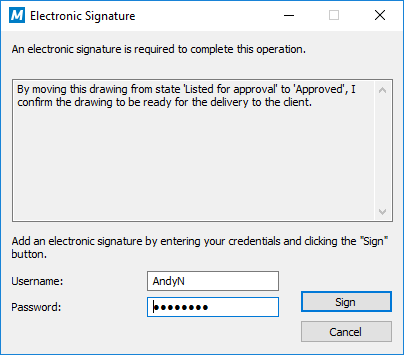 When you set an electronic signature for a state transition, requires the signature to change the state. The user must enter their identification data and log in to add the electronic signature. The state is changed when the object is checked in.
