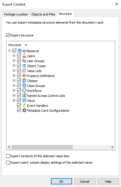 For more information about the options on this tab, see Export structure. - Check the All Elements option to export all