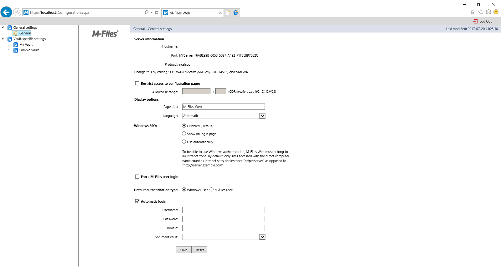Authentication (username, password and domain): If automatic login is enabled, this is the authentication information that uses for the automatic login. If you want to offer a specific ID for the user by default, save the default ID in the authentication information and disable automatic login. The user is still able to use other IDs, possibly granting more extensive web-based access.