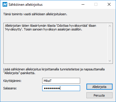 Voit muuttaa tilaa allekirjoituksella vain yksi kohde kerrallaan. Vain -tunnistusta käyttävät käyttäjät voivat tehdä tilasiirtymiä, jotka vaativat sähköisen allekirjoituksen. Sähköinen allekirjoitus ei siis tarkoita sähköistä "sormenjälkeä".