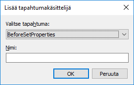 Anna uudelle tapahtumakäsittelijälle kuvaava nimi Nimi-kenttään ja napsauta OK. Lisää tapahtumakäsittelijä -ikkuna sulkeutuu.