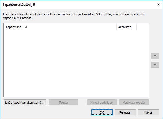 Esimerkki:Tarkista kaksoiskappaleotsikoiden varalta.Jos samantyyppisiä tapahtumakäsittelijöitä on useampi kuin yksi, voit vaihtaa niiden suoritusjärjestyksen valitsemalla tapahtumakäsittelijän Tapahtumakäsittelijät-ikkunassa ja napsauttamalla ikkunan oikean reunan ylös- tai alas-nuolipainiketta.