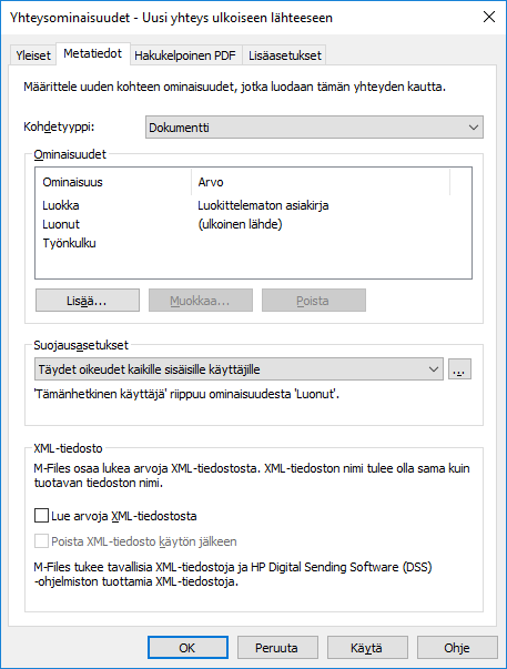 - Määritä ulkoisista tiedostoista luoduille kohteille automaattisesti lisättävä uusi ominaisuus ja arvo napsauttamalla Lisää... tai valitse jokin olemassa olevista ominaisuuksista ja muokkaa ominaisuutta napsauttamalla Muokkaa....