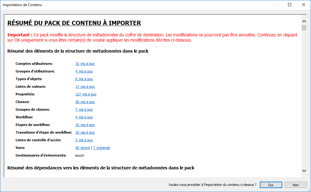 Avant de valider toute modification apportée au coffre de destination, présente un récapitulatif détaillé du pack de contenu à importer. Il est vivement recommandé de consulter attentivement le rapport sommaire détaillant les résultats de l'importation du contenu.