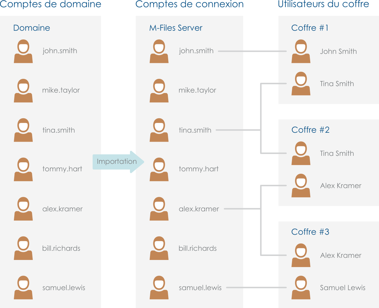 Le coffre comporte des utilisateurs qui doivent premièrement s’authentifier dans . Avant de déclarer des utilisateurs, vous devez créer des comptes de connexion sur . Ces comptes de connexion sont ajoutés aux coffres comme utilisateurs. Le même compte de connexion au serveur peut être ajouté à plusieurs coffres.