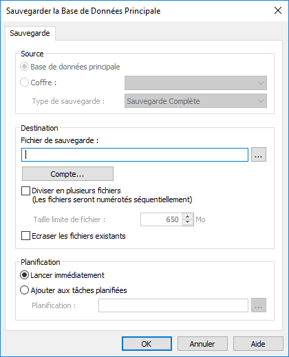 Dans la section Planification, sélectionnez l’option Ajouter aux tâches planifiées si vous souhaitez indiquer un programme récurrent pour la sauvegarde de la base de données principale.